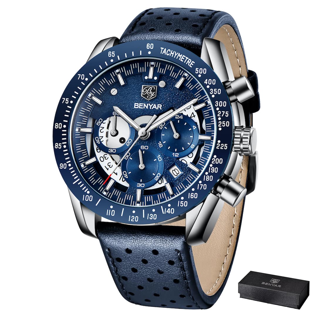 Orologio uomo Benyar Tachymetre Leather Blue è la combinazione perfetta di eleganza, funzionalità e resistenza. Realizzato con materiali di alta qualità e progettato pensando all’estetica moderna, il cinturino in pelle perforato per una migliore traspirazione e con cuciture decorative garantisce comfort e stile. Grazie alla sua adattabilità e funzionalità, è ideale per l’uso quotidiano e per occasioni speciali. Investi in un orologio che completerà il tuo stile personale e offrirà prestazioni affidabili giorno dopo giorno.