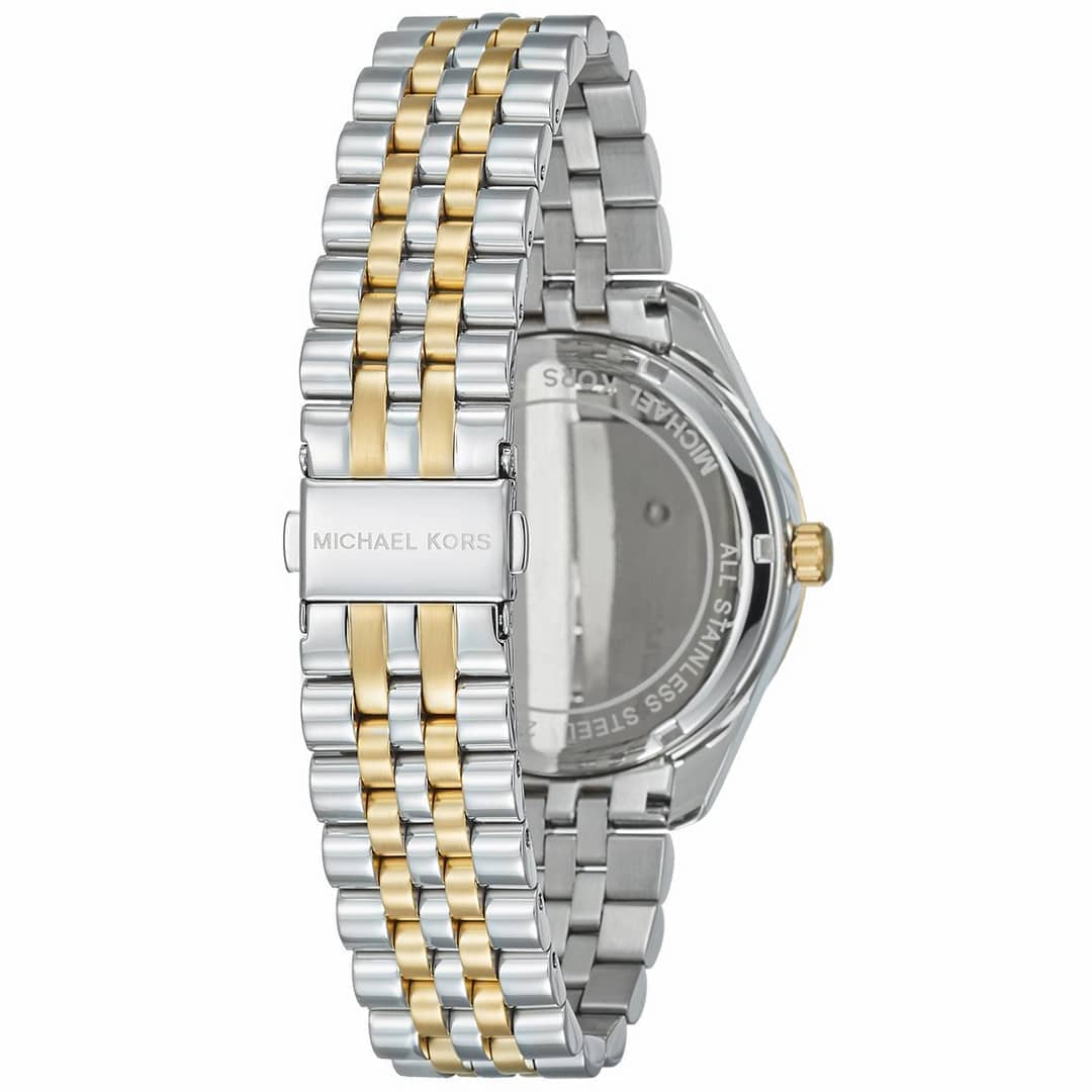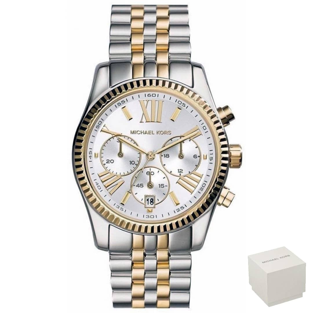 L’orologio donna Michael Kors MK5955 è un orologio alla moda e di grande impatto visivo, con display analogico in finitura lucida bicolore, argento e oro. L’orologio è dotato anche di cronografo (cronometro), indicazione della data e visualizzazione delle ore del giorno.